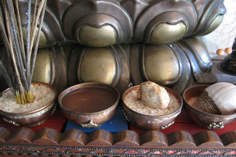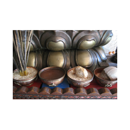 Il s’agit dans son ensemble d’un présentoir à offrandes (tche-sham) adressées aux bouddhas et aux divinités présents sous forme de statues. Les bols d’offrandes (héritage des traditionnelles offrandes indiennes des Rajahs) et les lumières occupent une place de choix avec le mandala (représentation de l’univers).