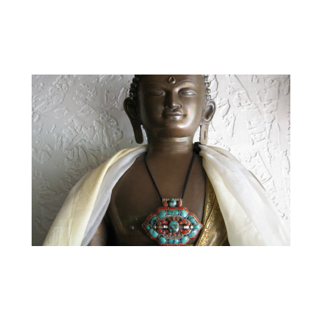 marquée du mantra de Kalatchakra, désigne la Roue qui dissipe toute imperfection de l'univers et des êtres, et qui fait s'épanouir toutes qualités, symbolise le fondement de la voie ouest le code éthique des dix vertus : ne pas tuer, ne pas voler etc. ... le chemin progressif des dix terres de Bodhisattva (dix degrés qui conduisent depuis la première étape de la libération jusqu'à la Plénitude de l'Eveil ainsi que les dix forces qui sont celles de l'esprit d'un Bouddha).