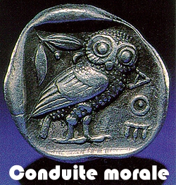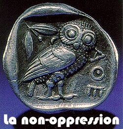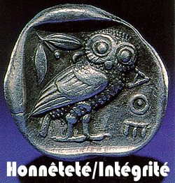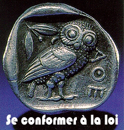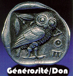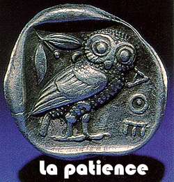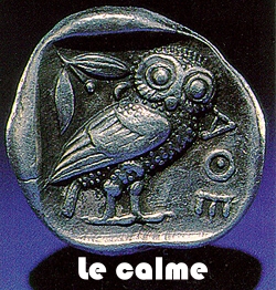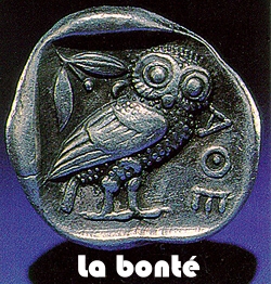 La chouette est le symbole de la sagesse dans le monde antique, elle est liée à la déesse grecque Athéna. Déesse des Arts et de la sagesse de la guerre défensive de l'activité intelligente, elle prête son symbole ailé à la ville d'Athènes, qui frappe sa monnaie à l'effigie de l'animal qui se retrouve actuellement sur la pièce grecque de un euro. (ci-dessous Pièce de monnaie 450-420 av. JC.)