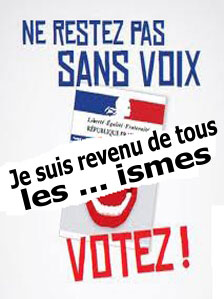 Je ne pense pas seulement aux Français mais à tous les citoyens de pays dits "démocratiques", malgré tout nantis et encore préservés bien que le phénomène tragique de l'exclusion prenne de plus en plus d'ampleur. Certes j'ai perdu un grand nombre d'illusions mais je prends la peine de m'inscrire sur les listes électorales. Entre d'un côté, l'engagement fanatique, les illusions que l'on peut nourrir sur tous les miracles qui se produiraient si seulement la gauche ou la droite, selon le camp dans lequel on se situe, revenait au pouvoir, et de l'autre l'individualisme forcené, il y a un juste milieu.