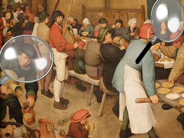 Mais où se trouve son époux ? Nulle place vide à côté d’elle. On voit, tout près, la coiffe blanche de sa mère, d’une sœur, d’une amie peut-être. On voit un moine qui parle à un gentilhomme barbu et à l’air pensif. Tiens, cet homme vêtu de sombre croise les doigts de la même façon que la mariée : serait-il, quoique plutôt âgé, l’époux que nous cherchons en ce tableau ? Au fond de la salle, les gens se bousculent, portant leurs enfants, ils veulent boire et participer aux agapes. Certes à ce banquet il ne manque rien, le vin coule en abondance et les serviteurs apportent des écuelles bien remplies. Assise par terre, une fillette sauce son assiette et se lèche les doigts tandis qu’un chien passe la tête de dessous la grande table, moins pour happer quelque relief que pour écouter les propos du moine…