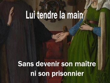 La chance que nous offre l’amour consiste non pas à ne faire qu’un mais à devenir unique. L’amour ne réduit pas l’autre en servitude et ne le fait pas semblable à soi. Il ne met pas fin à la solitude, il la polit et la fait rayonner, tel le miroir situé entre les deux visages des époux et à la verticale du petit chien blanc, miroir bombé qui reflète une scène bien plus large que celle de deux êtres réunis par les liens du mariage. Le choix s’adresse à chacun de nous : être un gentil chien ou un miroir du monde, une fenêtre ouverte : se définir comme épouse, comme mari, ou demeurer soi, demeurer autre, dans cette distance de solitude que deux mains confiantes peuvent dissiper. Dans le regard visionnaire de Van Eyck la véritable dot qu’apporte la promise au marchand tient en cette inépuisable richesse de solitude. Certes, toute la scène est sacrée : épouser l’autre n’est pas se confondre, c’est s’incliner devant la majesté de solitude, devant le mystère de solitude qu’il est, inéluctablement.