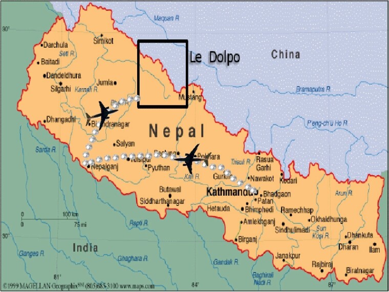 Le district de Dolpa est une enclave de culture tibétaine qui dépend du Népal. Géographiquement, c'est une terre aride, où l'on ne peut accéder qu'après avoir franchi de vertigineuses barrières rocheuses. Les hommes y vivent depuis des siècles de l'élevage et du troc.