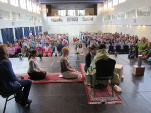 C’est la bénédiction collective de Mère Meera à la fin du Darshan. Après que la dernière personne ait reçu le Darshan personnel, Mère reste assise avec les yeux fermés pendant environ 3 – 4 minutes pour bénir l’assistance.